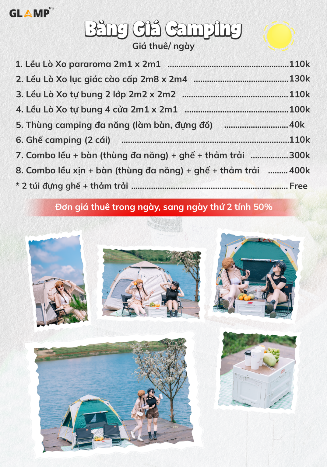 - Combo Lều + Bàn (Thùng đa năng) + Ghế + Thảm trải: 300,000 VNĐ/ngày
