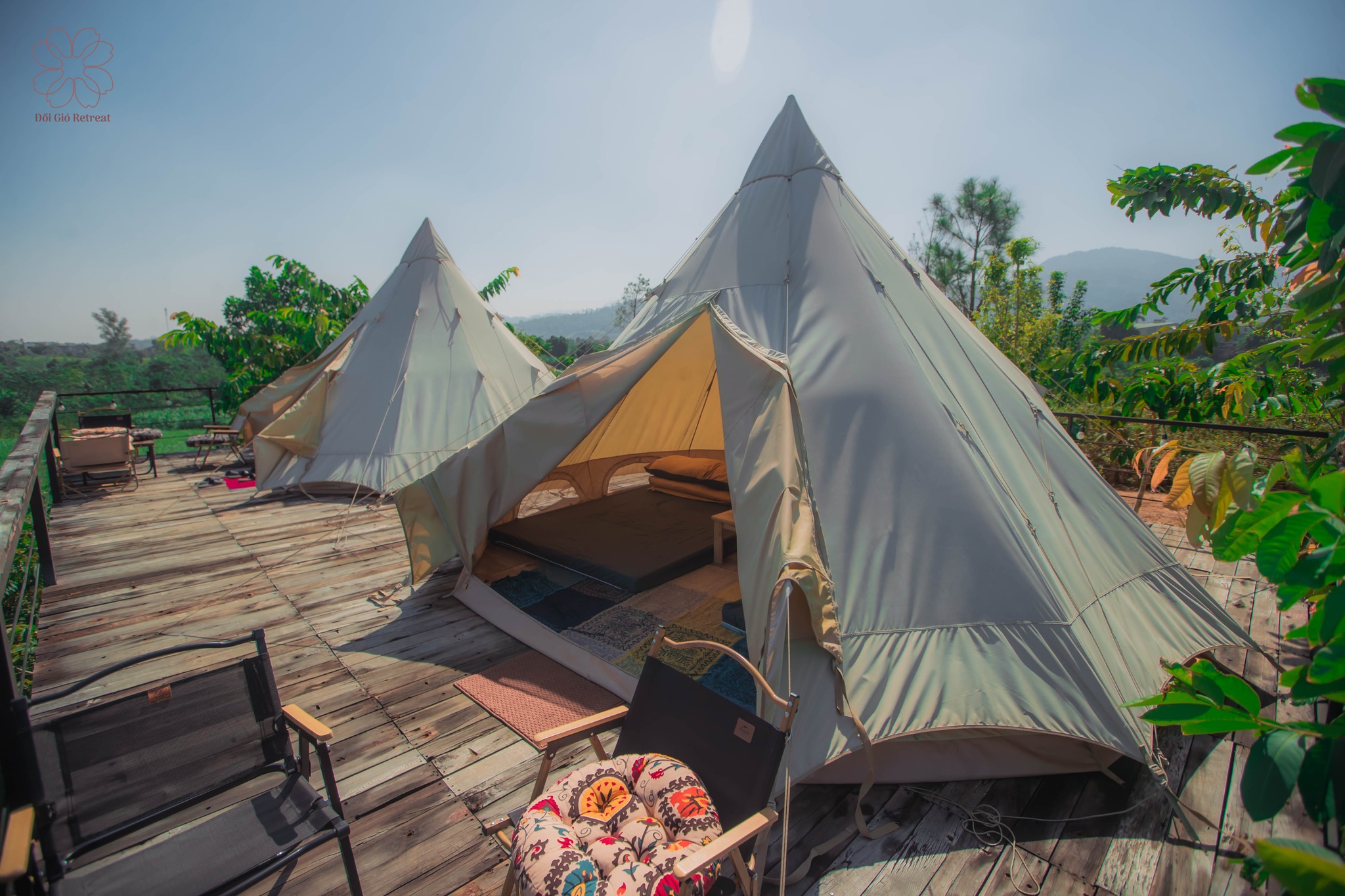 Đồi Gió Retreat là khu glamping nổi tiếng nằm ở Ba Vì, Hà Nội. Nơi đây có khung cảnh thiên nhiên hoang sơ, hùng vĩ được bao quanh bởi núi non hùng vĩ, cùng với không khí trong lành, mát mẻ, mang đến cho bạn cảm giác thư thái và dễ chịu.