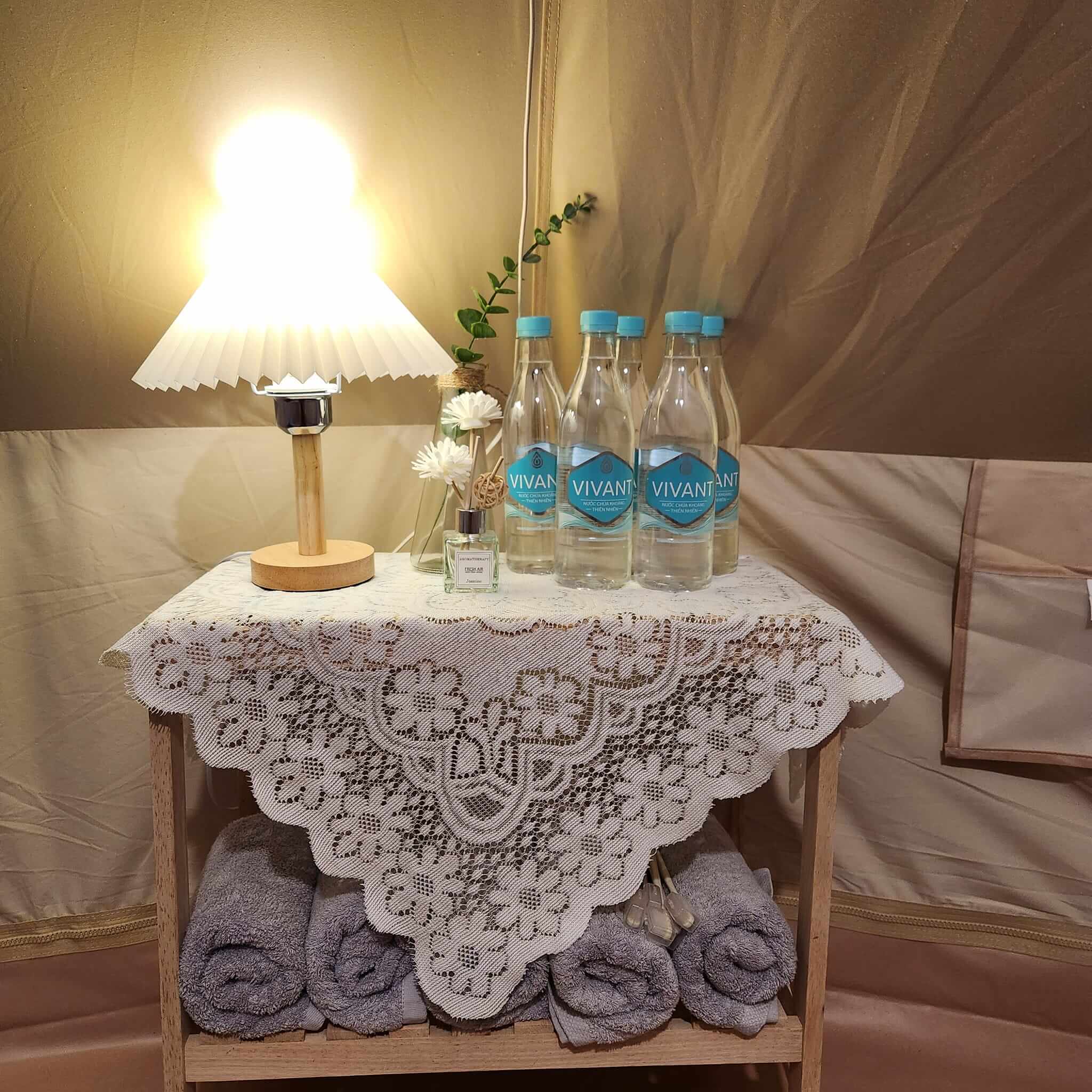 - Lều máy lạnh cao cấp, đầy đủ tiện nghi, nước suối.