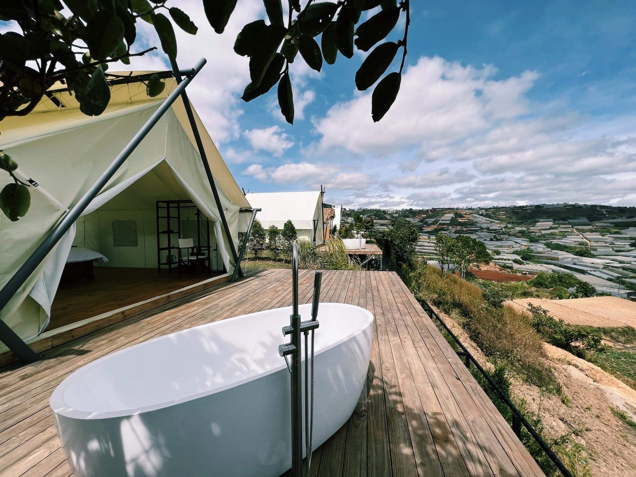 - Toilet bên cạnh lều, bồn tắm ở trước lều.