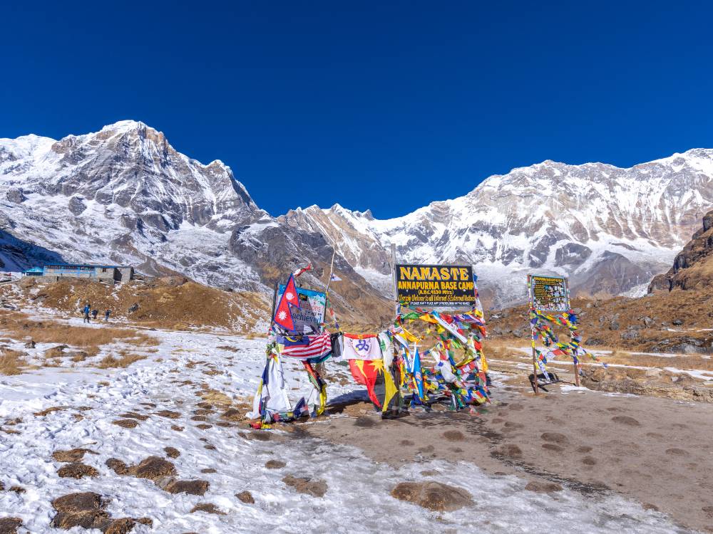 - Trên cung đường này bạn sẽ ngắm nhìn thung lũng sông băng trên cao với cảnh đẹp của dãy Annapurna ngày càng tuyệt vời hơn, cuối cùng bạn thấy mình đang đứng ở Annapurna Base Camp (4,130m), bao quanh 360 độ bởi những đỉnh tuyết sơn trên 7,000m.