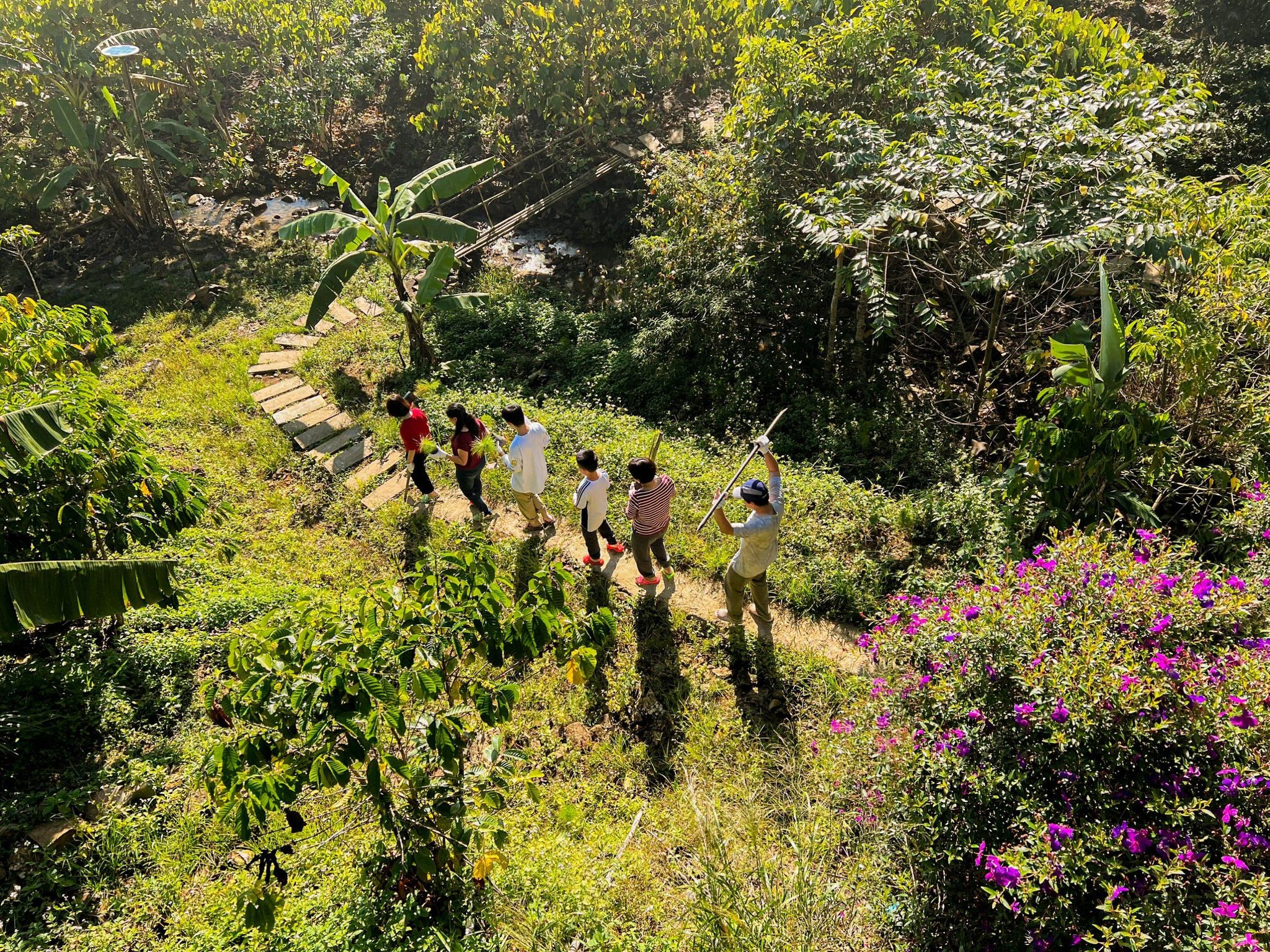 - Khách trải nghiệm đi đường mòn lên núi phí dẫn đường: 300k/lượt
